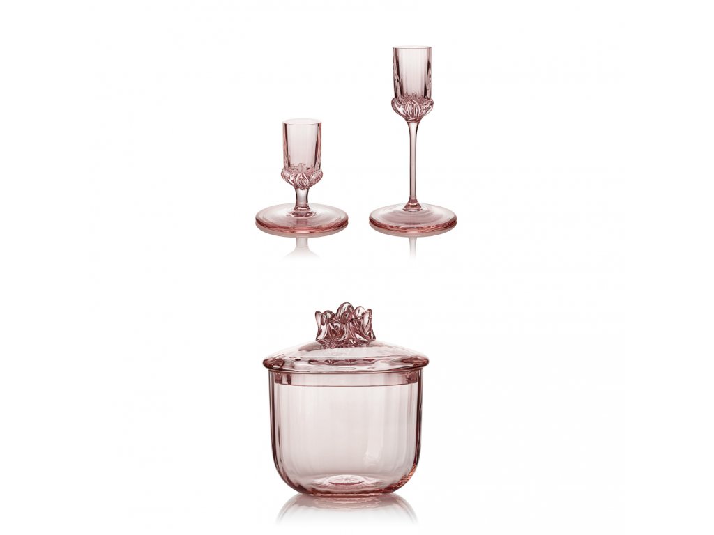 Dárkový balíček skloglass s ručně foukanou dózičkou s víčkem, svícny 7cm a 13cm Sakura a dvě bílé svícky. Unikátní Sakura design je výjimečný svým hranováním z vnější strany výrobku. Takzvaný optiš si hraje s lomem světla. Tento balíček je k dostání i v křišťále a alexandritu.