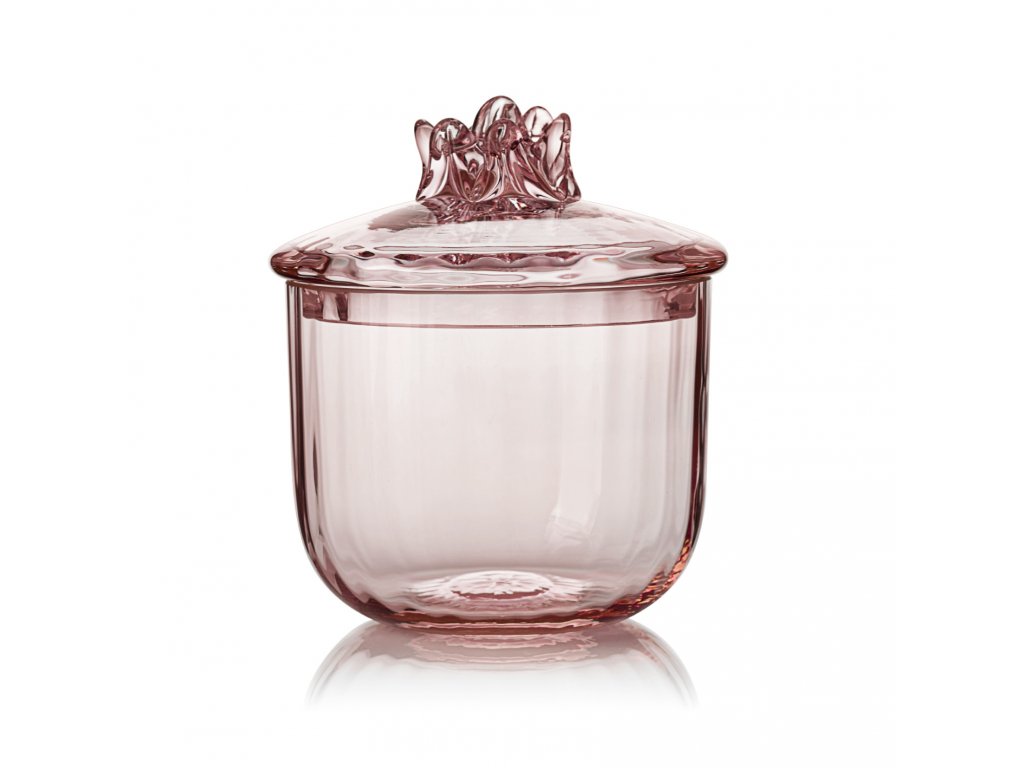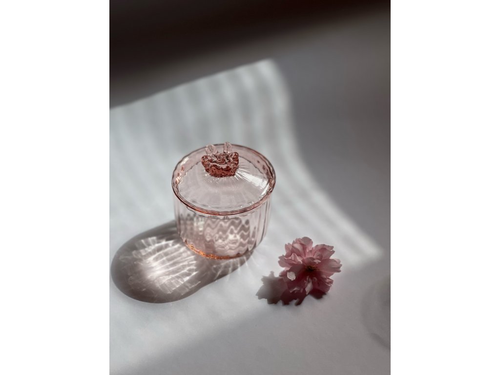 Skloglass ručně foukaná dózička s víčkem Sakura připomínající něžný květ sakury. Unikátní design je výjimečný svým hranováním z vnější strany dózy. Takzvaný optiš si hraje s lomem světla. Jemný květ na víčku se ručně tvaruje a díky tomu je každý kus zaručený originál.
