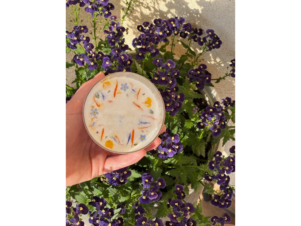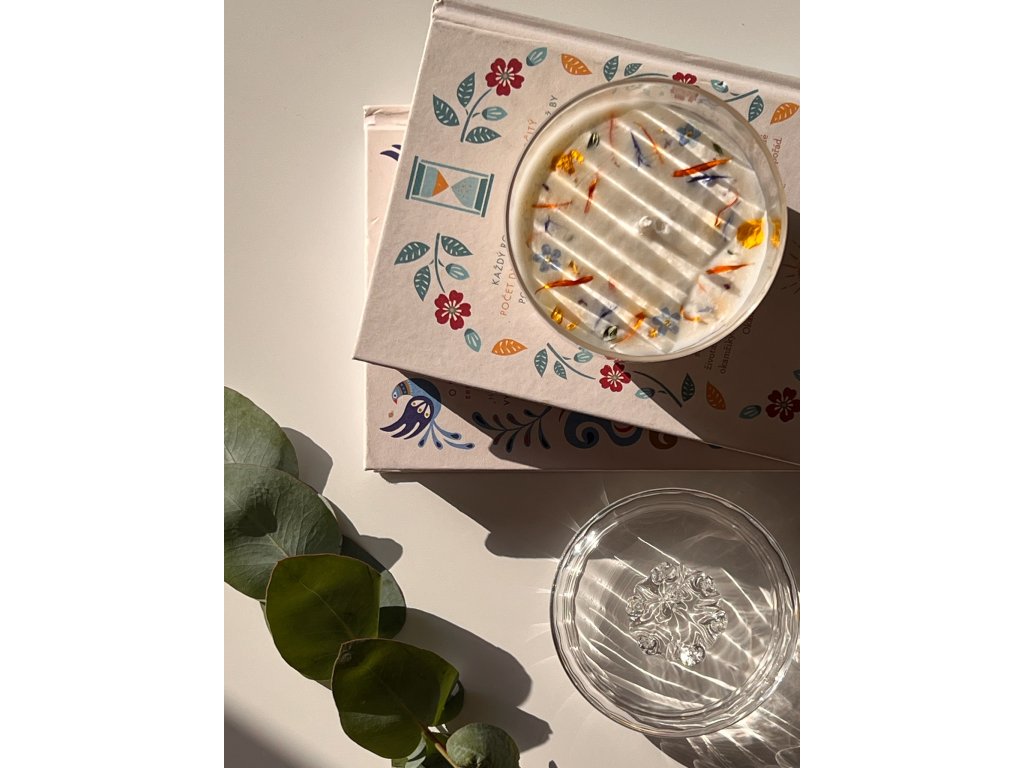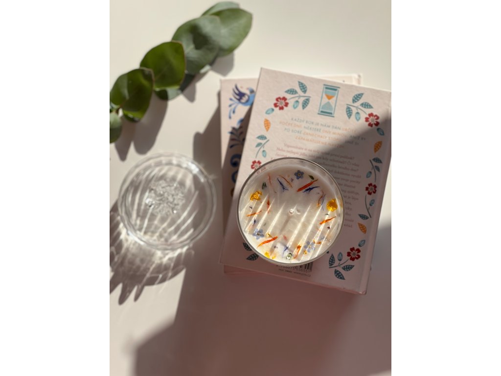 Složení: sójový vosk, parfémová kompozice Bez černý a Lípa, sušené květy z farní louky